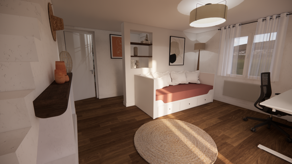 Le rez-de-chaussée, initialement un garage et un studio, accueille à présent un bureau, une chambre d’amis et une salle de bain.