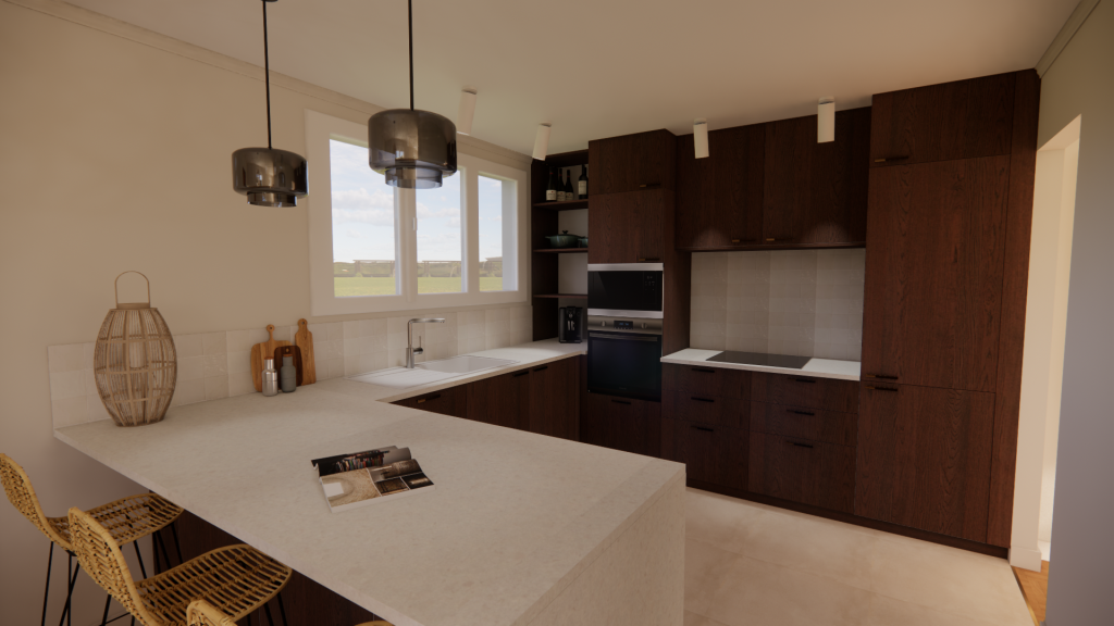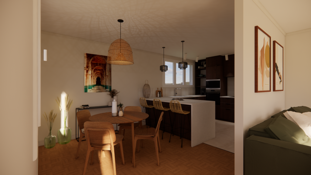 La cuisine s’ouvre désormais sur la salle à manger, l’entrée est repensée pour une meilleure circulation, et chaque pièce est rénovée, notamment la salle de bain entièrement réagencée.