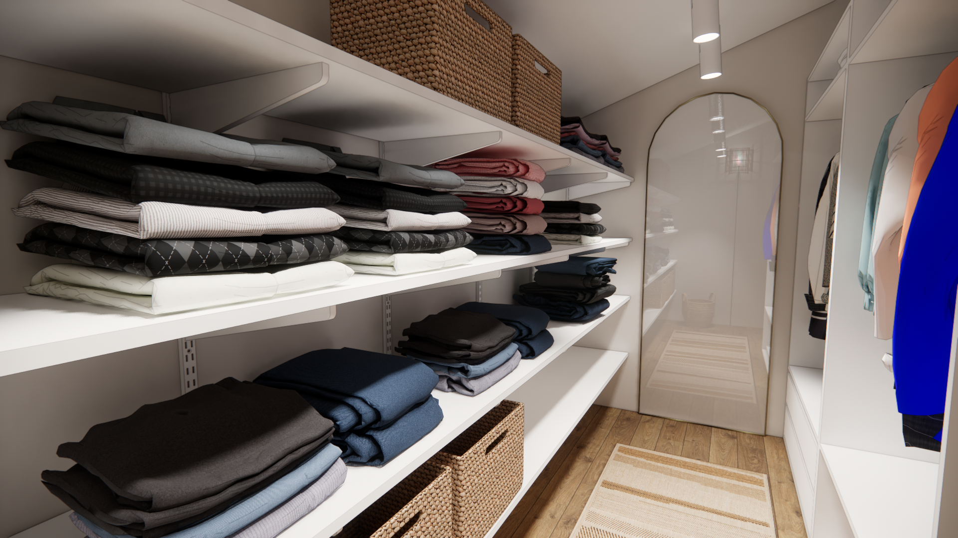 L’enjeu était de préserver la sensation d’espace dans la chambre tout en apportant une solution de rangement généreuse et bien organisée.